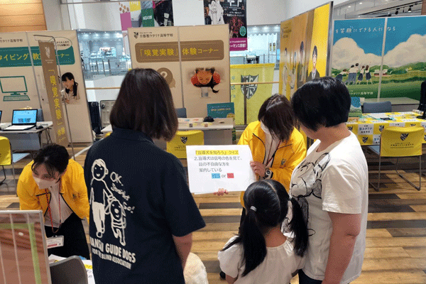 看護科のブースでは専攻科4年生の生徒が大活躍!血圧測定や新生児人形の「だっこ体験」を実施しました。普通科「どうぶつ」ブースでは、関西盲導犬協会の方とモデル犬「マギー」も参加してくださりました。