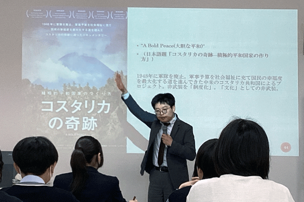 前半では、「人間は生まれながらにして…」どうあるべきかという人に対する理解の仕方についてお話いただき、後半は「平和の文化について考える」をテーマにしたお話をしていただきました。「力による線引きをしない」という考え方や「軍隊を持たないコスタリカ共和国」の対話による解決、交渉をすることの大切さを説いていただき、人間をモノではなく、人として尊重することの大切さを生徒たちは学ばせていただきました。