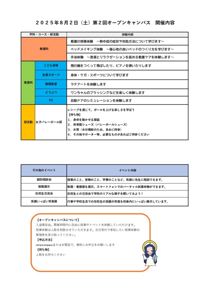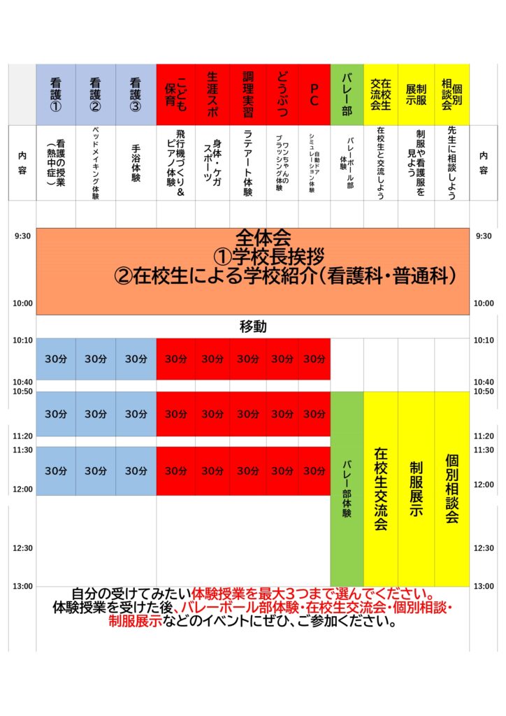 12:30 終了予定(授業体験後、希望者は部活動体験(女子バレー部)、個別相談、在校生交流会に参加可能)