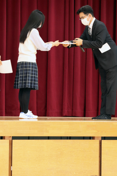 7月18日(金)終業式にて、普通科3年生が受検した「全国家庭科食物調理技術検定3級」の合格証授与式を行いました。 受検者2名とも合格し、晴れやかな表情で賞状を校長先生から受け取りました。
