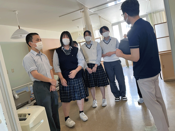 3年生健康スポーツ系の生徒たちが、特別養護老人ホーム「ヴィラ多国山」へ施設見学に行きました。はじめに、小中宏三総合施設長から「実りある施設見学になるように」と温かいご挨拶をいただき、続いて白波瀬介護主任のご案内で施設内を見学しました。その後、1つのユニットに入り、利用者の方々と一緒に体操やクラフトワークを行いました。