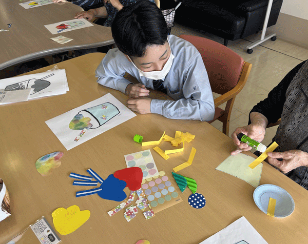 最初は緊張していた生徒たちも、利用者さんの笑顔と優しい声かけに安心し、次第に元気になって楽しそうに工作に取り組んでいました。