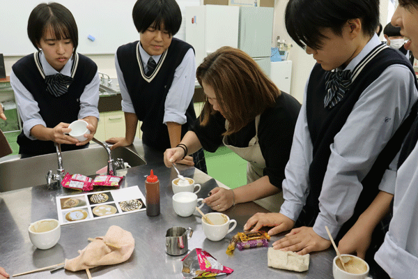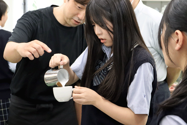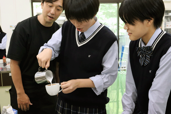 9月3日(水)、普通科2年生の「総合的な探究の時間」では、コーヒーの歴史や効能、種類などについて学びました。その後、プロのバリスタである伴先生と黒川先生の指導のもと、ラテアートを体験しました。先生方には、本校に10年前から授業に来ていただいており、生徒たちは専門的な技術や知識に触れる貴重な機会を得ています。今回の授業では、探究活動の一環として、プロフェッショナルによる講義を受ける実践的な学びの場となりました。