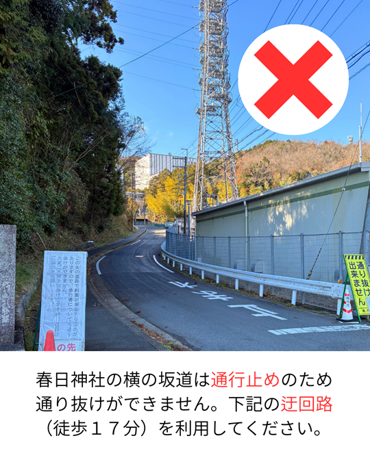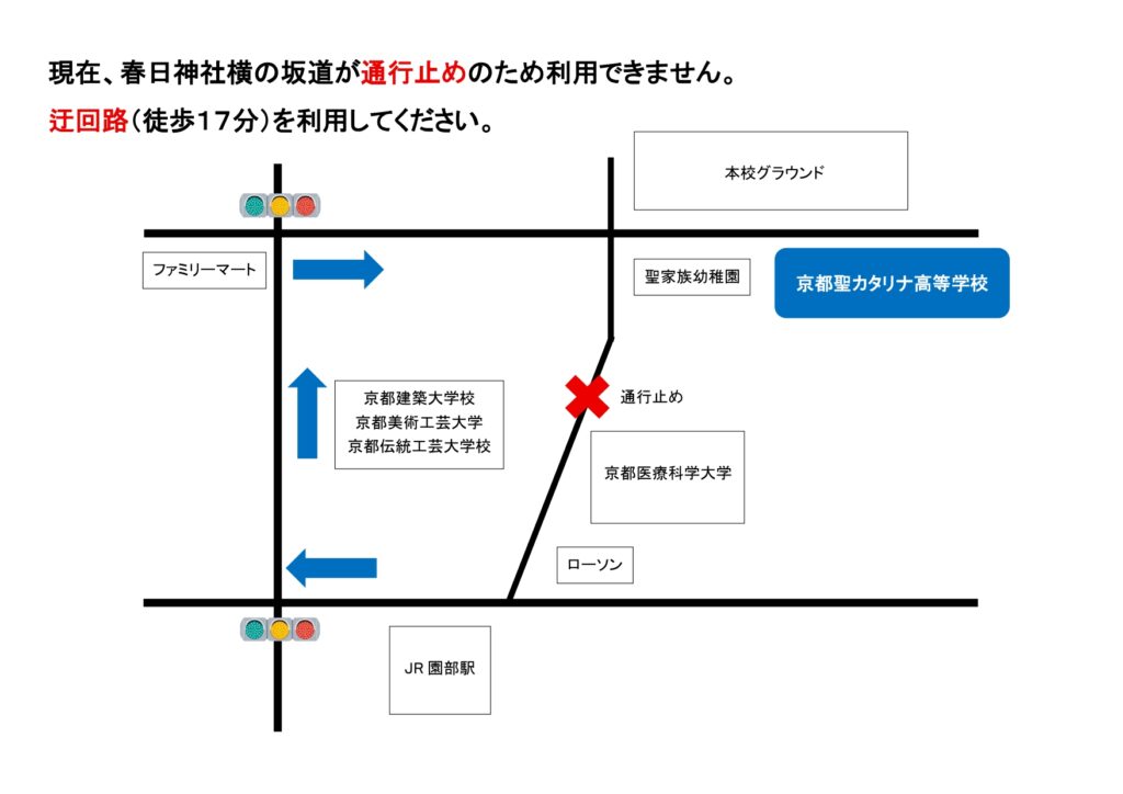 JR園部駅から京都医療科学大学〜聖家族幼稚園前の道は、大雨による崩落の危険があるため、通行止めになっております。通行止めはしばらく続く予定ですので、迂回路をご利用くださるようお願いします。
