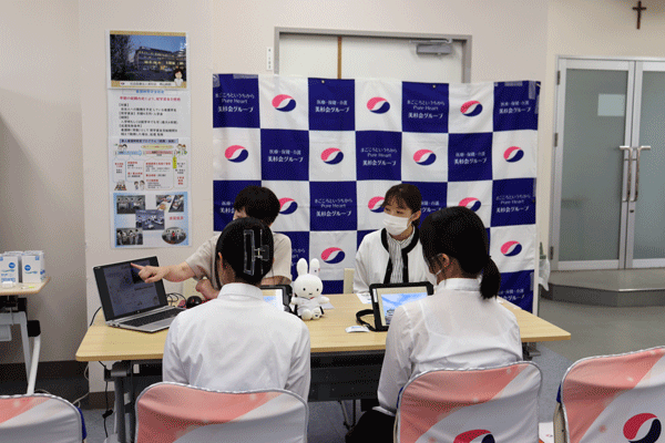就職説明会では、施設ごとにブースを設け個別相談形式で、1.2年生は混合、3.4年生は学年ごと、事前に希望を募った施設を中心に1人あたり6ブースから説明を受けました。
