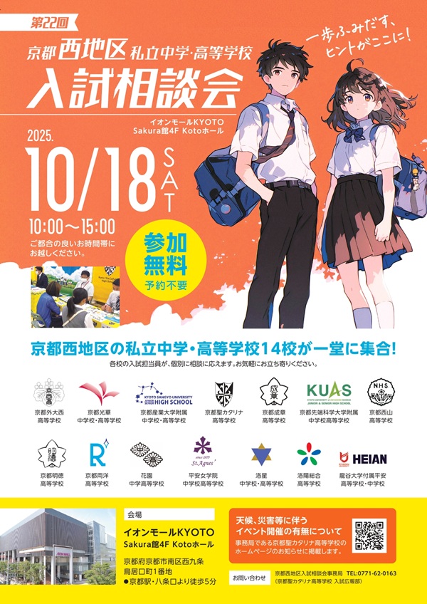イオンモール京都で開催される、「京都西地区私立中学・高等学校 入試相談会」に京都聖カタリナ高等学校もブース出展いたします。