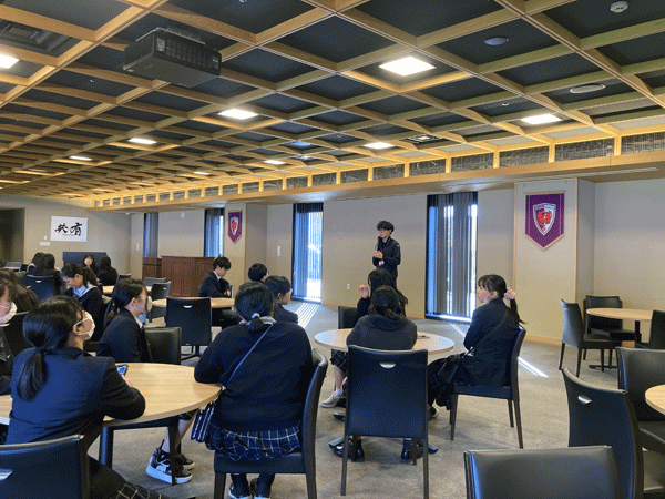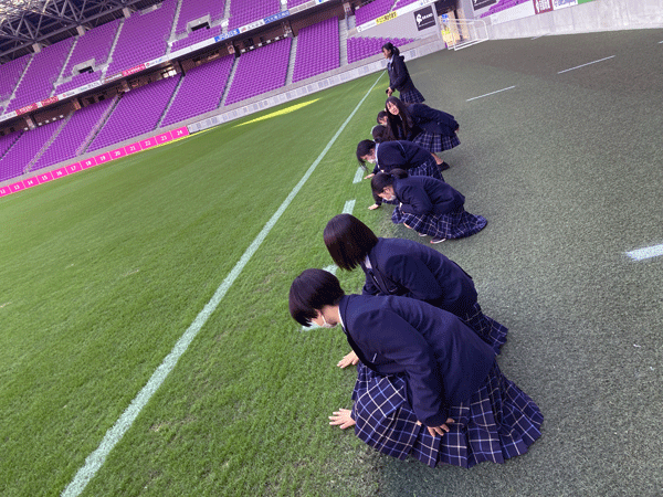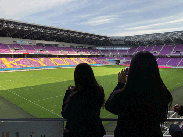 11月7日(金)、1年生普通科のマイドリーム講座(健康スポーツ)では、亀岡市にある「サンガスタジアム by KYOCERA」を見学しました。京都らしさを取り入れたスタジアムの内装や、普段は入ることができない場所をたくさん見学させていただきました。生徒はピッチの中には入れませんでしたが、グラウンドのすぐ近くまで行き、珍しそうに芝生に触れていました。